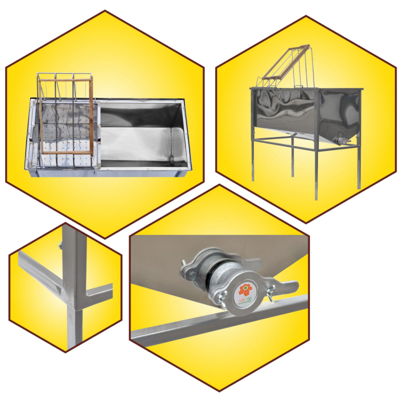 Stół wykonany z blachy kwasoodpornej o dnie profilowanym trapezowym, wyciągany kosz ze stali kwasoodpornej, zawór na miód klapkowy, nóżki stalowe, wysokość regulowana. W zestawie podstawka do odsklepiania ramek. Stół przystosowany do zawieszania ramek o szerokości 435mm.